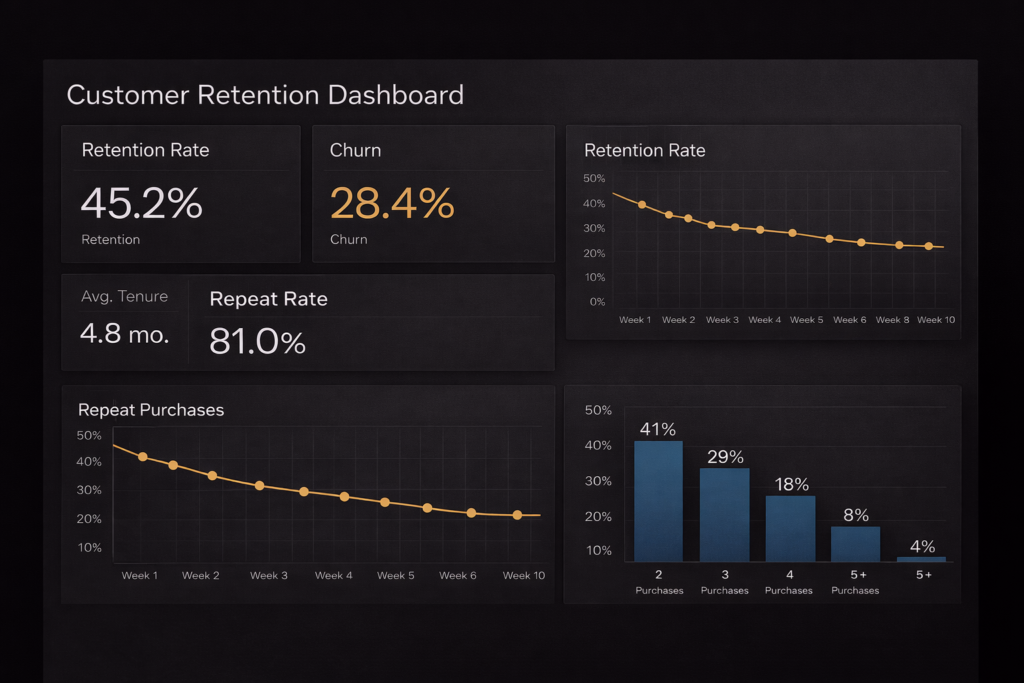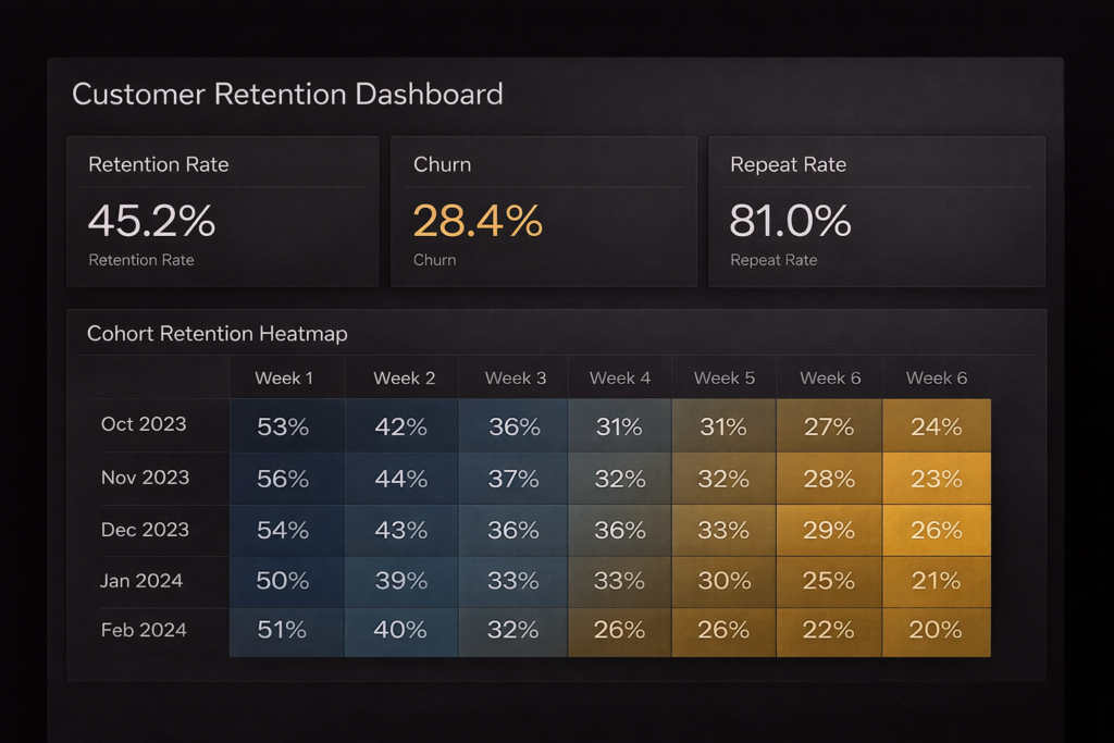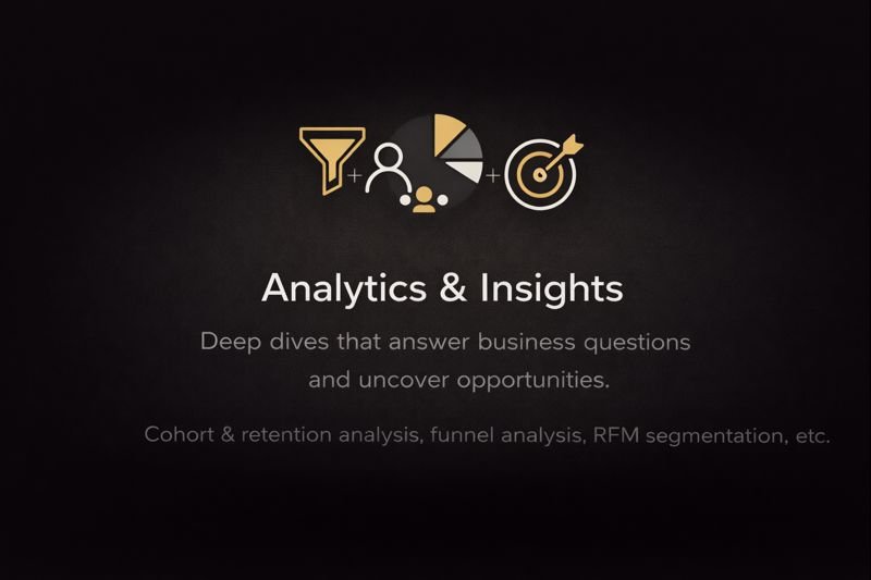 Problem: Unclear retention and churn drivers. Solution: Cohorts + churn + repeat purchase dashboard. Impact: Clear insights to improve retention and CLV.