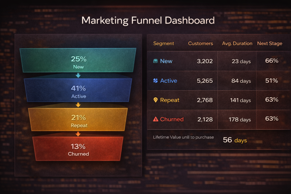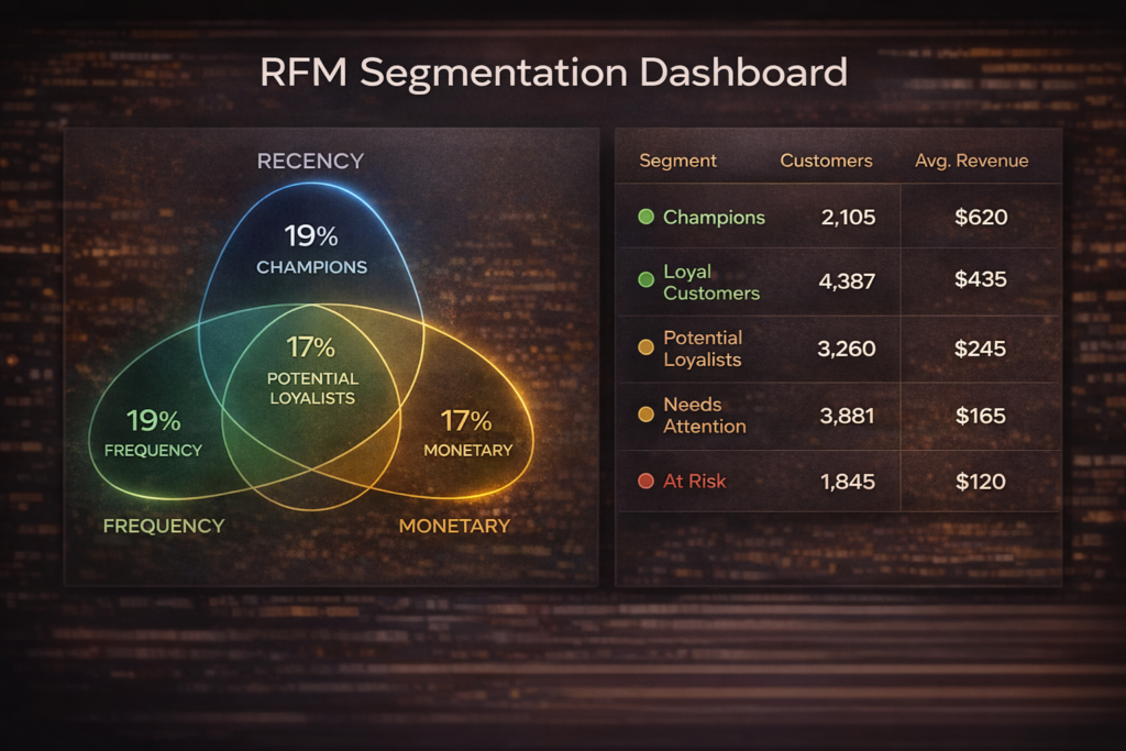 Problem: Unclear funnel performance and no customer value segmentation. Solution: Funnel + RFM dashboards to track CPA/conversion and key customer groups. Impact: Better budget decisions and more targeted retention/CLV growth.